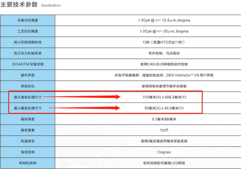 從上圖參數表上,可以清晰的看到dek 03ix的過板最大和最小尺寸分別是多少。