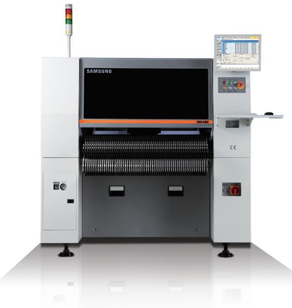 Samsung三星貼片機SM482 是在高速貼片機SM471的平臺基礎上針對異型元器件對應能力進行強化的,配有1個懸臂6個軸桿的泛用機,最大可貼裝□55mm IC,支持Polygon識別方案,并且針對形狀復雜的異型元器件提供最優的解決方案